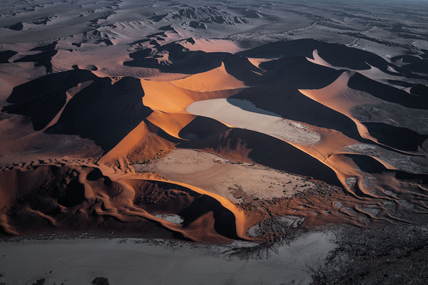 I remember this day as if it were yesterday. We were flying over a landscape sculpted by wind, water and time into pure abstraction. The soft light created an unreal contrast between deep shadows and glowing golden dunes. Then my eye caught this remarkable formation, a dune sculpted into the shape of a fork.